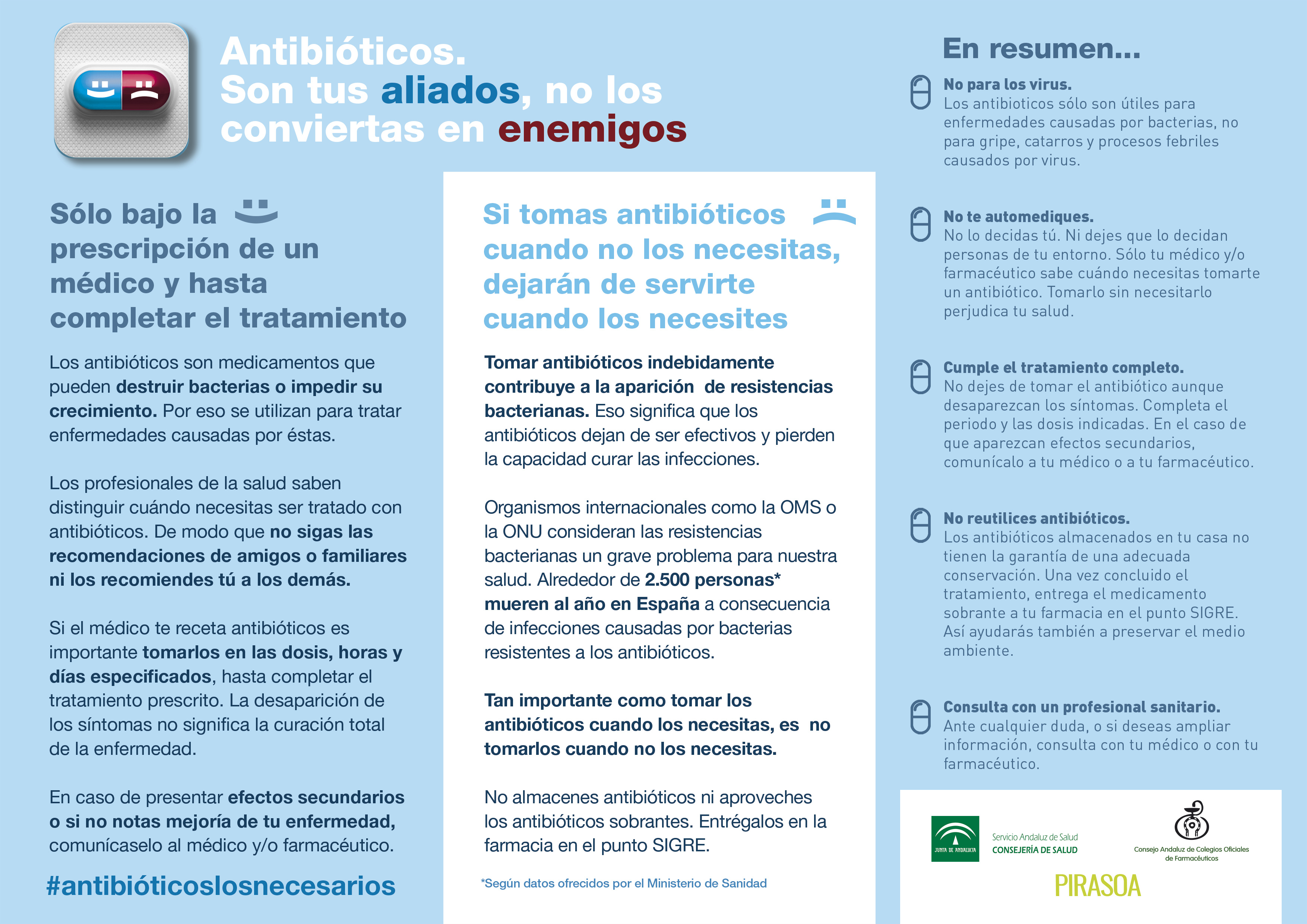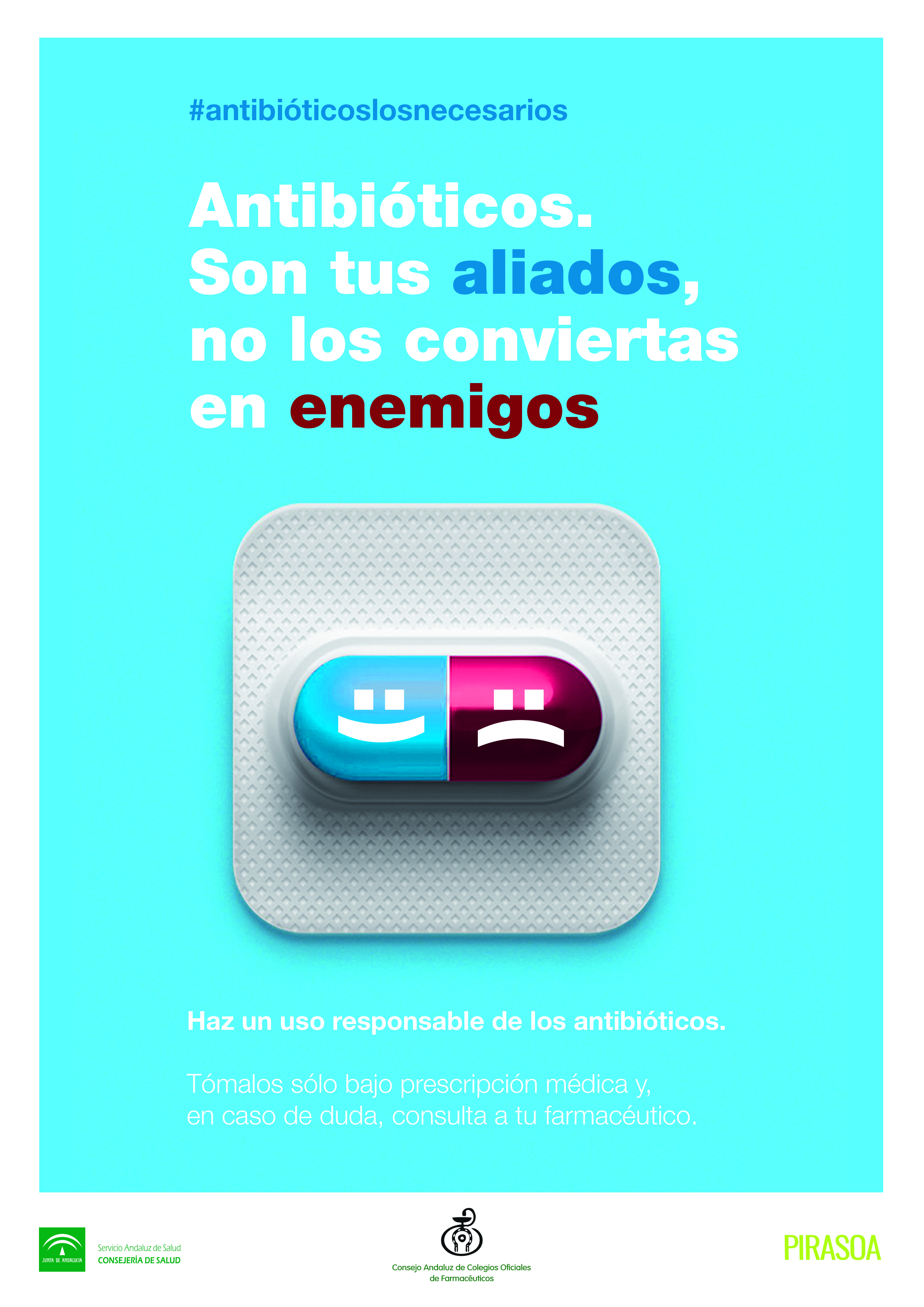 Con el hashtag #antibióticoslosnecesarios, el Consejo Andaluz de Colegios de Farmacéuticos ha puesto en marcha una campaña que advertirá a los pacientes y usuarios de las farmacias andaluzas que «si toman antibióticos cuando no lo necesitan, dejarán de servirles cuando lo necesiten», informándoles que alrededor de 2.500 personas mueren al año en España por infecciones causadas por bacterias resistentes a los antibióticos.