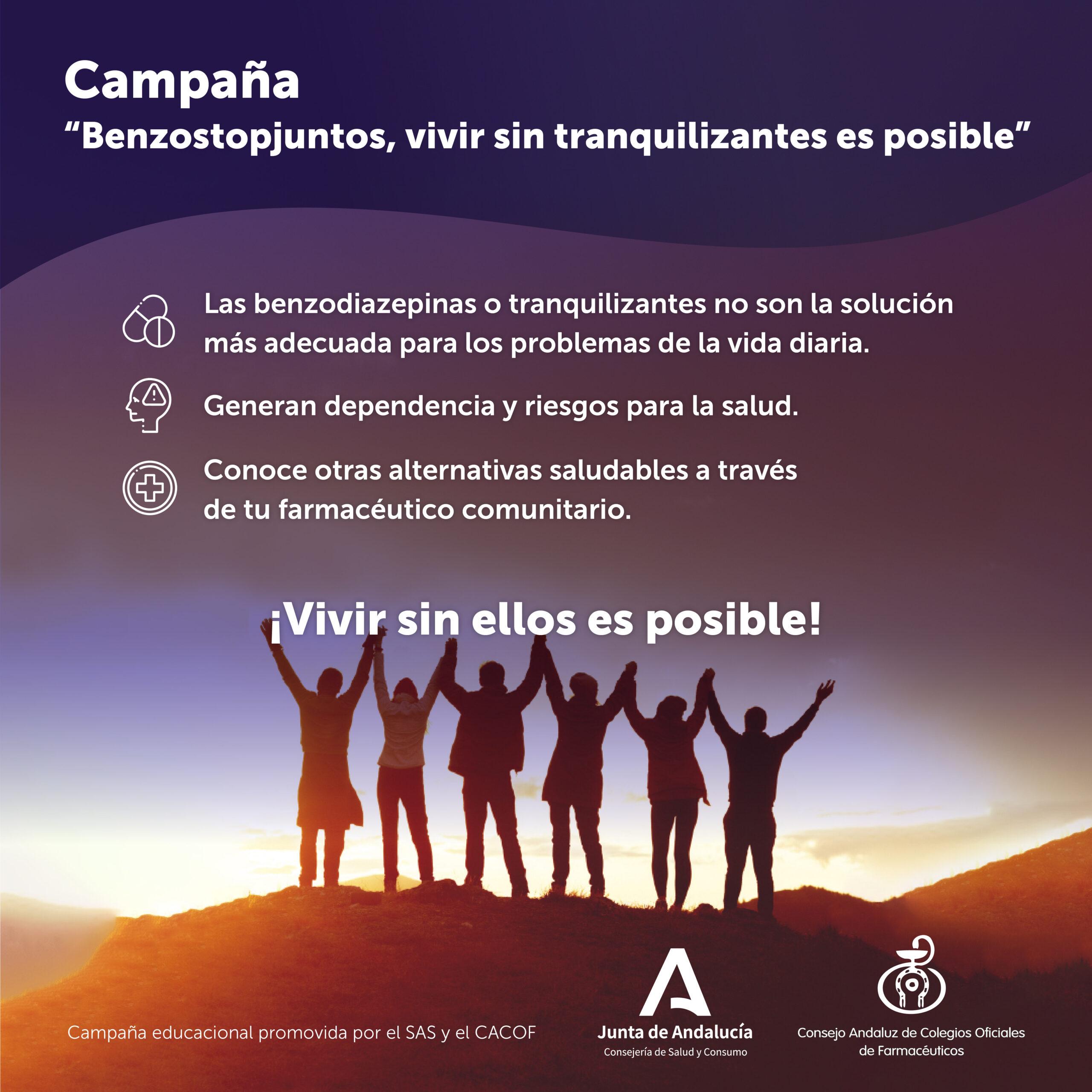 El Consejo Andaluz de Colegios de Farmacéuticos (CACOF) está colaborando con la campaña ‘Benzostopjuntos, vivir sin tranquilizantes es posible’, promovida por la Consejería de Salud y Consumo con el fin mejorar y reducir el uso de las benzodiazepinas (tranquilizantes) entre la población, concienciando a los pacientes y profesionales sanitarios para evitar el abuso y mala utilización en el consumo de estos medicamentos por el riesgo de su uso continuado.