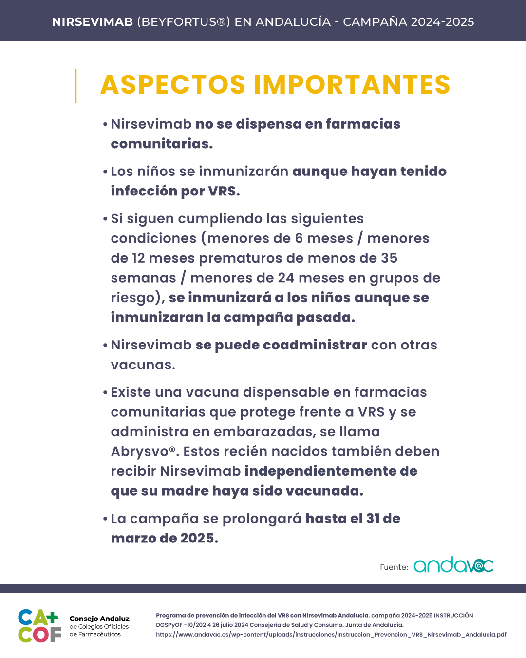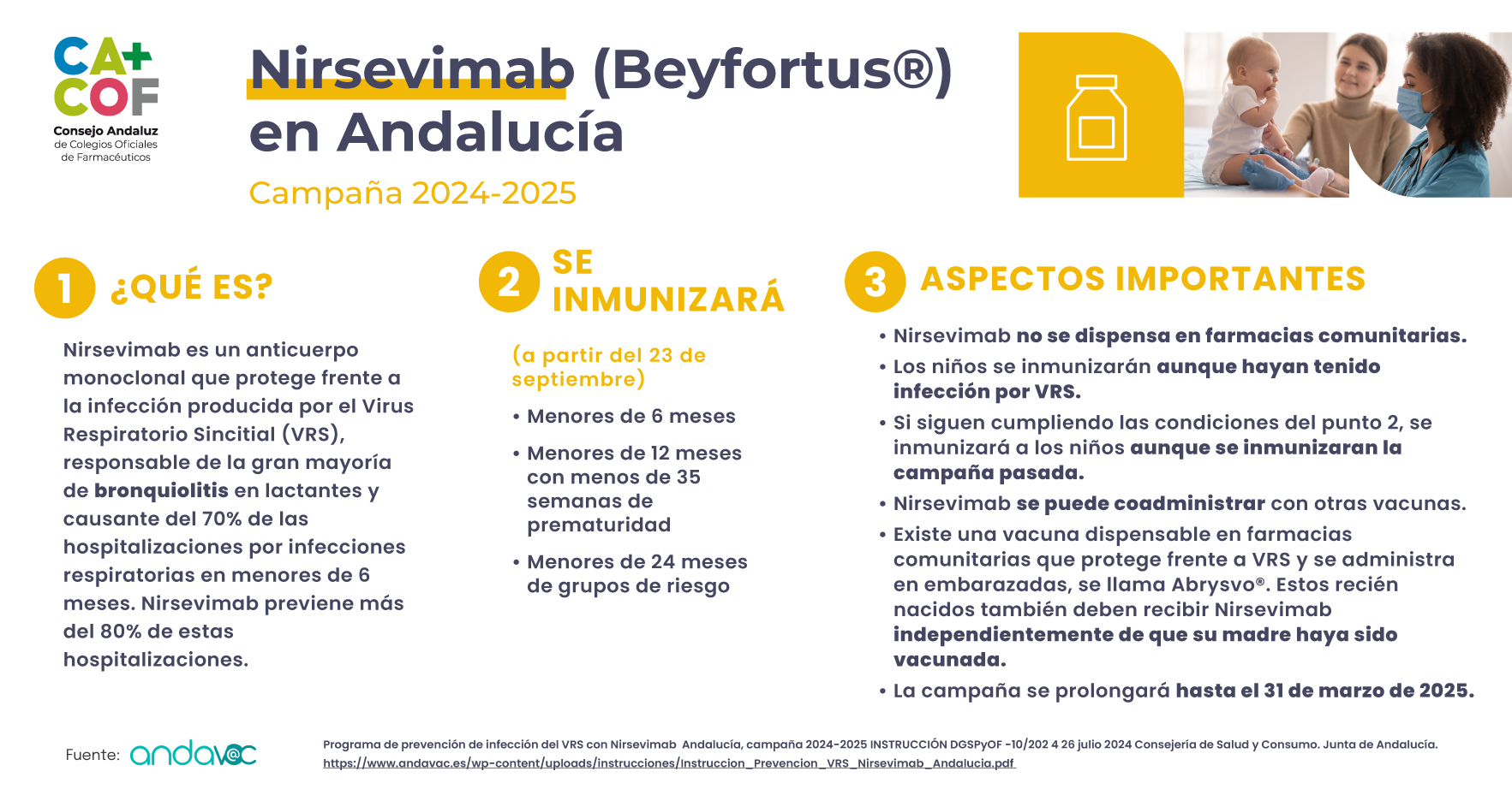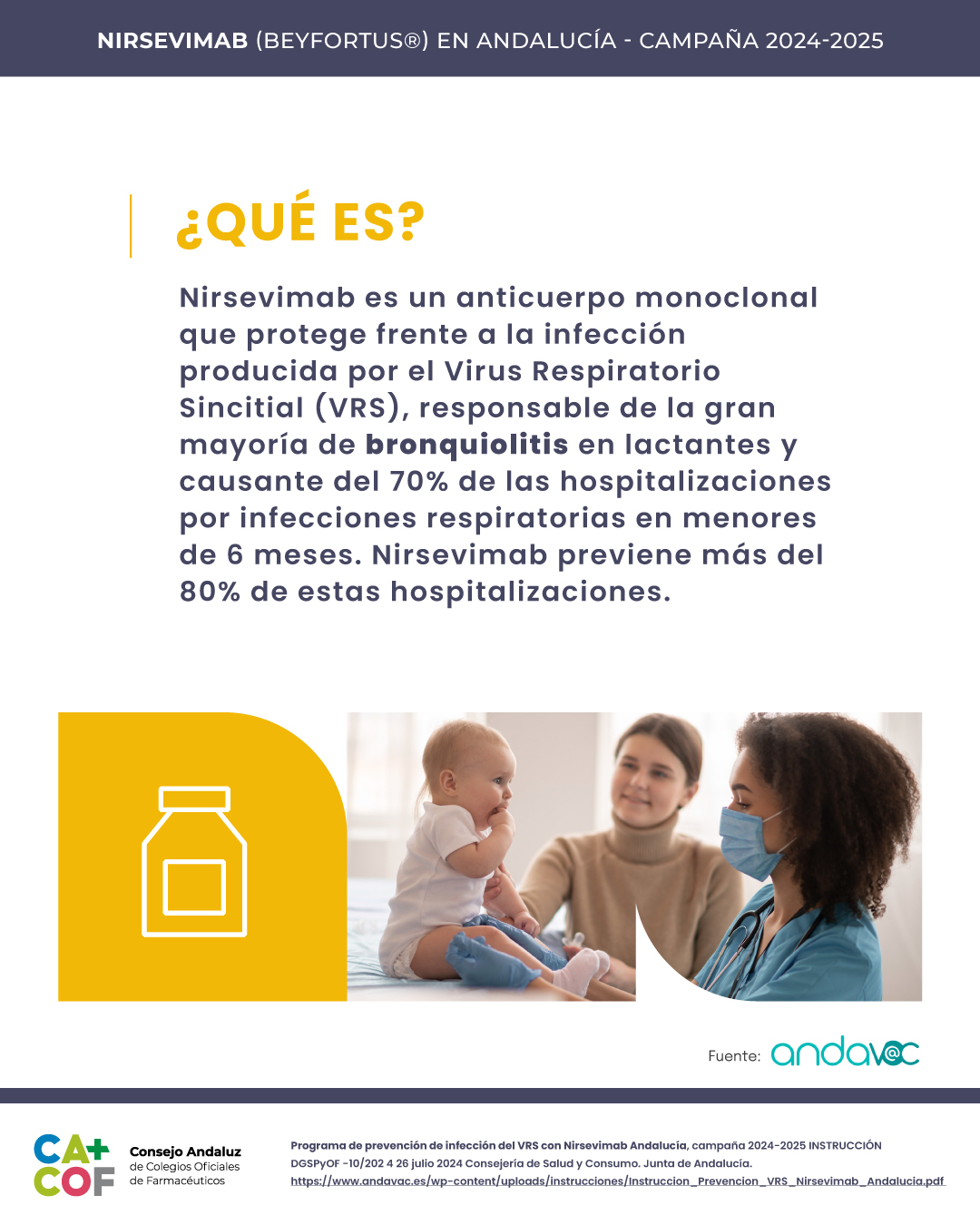 El 23 de septiembre de 2024 se inicia en Andalucía la campaña de vacunación de Nirsevimab contra la bronquiolitis causada por el Virus Respiratorio Sincitial (VRS), que tiene como objetivo la inmunización frente al virus en recién nacidos y lactantes menores de 6 meses, y prevenir así la bronquiolitis. Esta campaña está promovida por ANDAVAC, el Plan Estratégico de Vacunaciones da la Consejería de Salud y Consumo, y durará hasta el 31 de marzo de 2025.