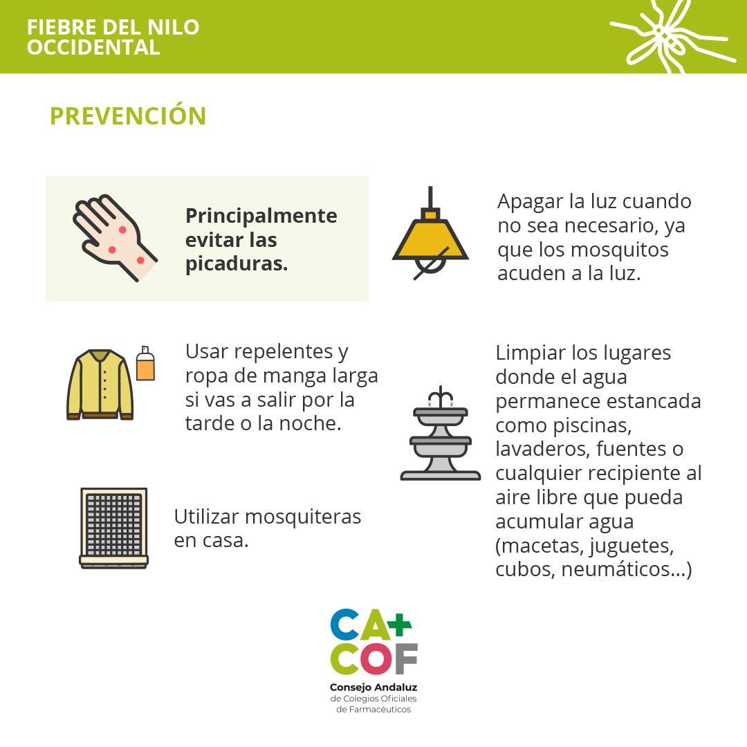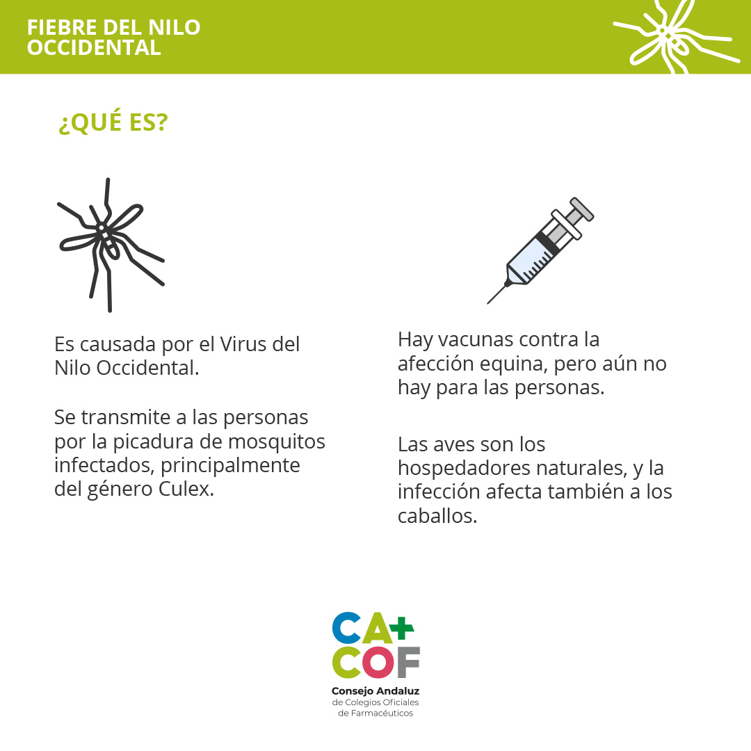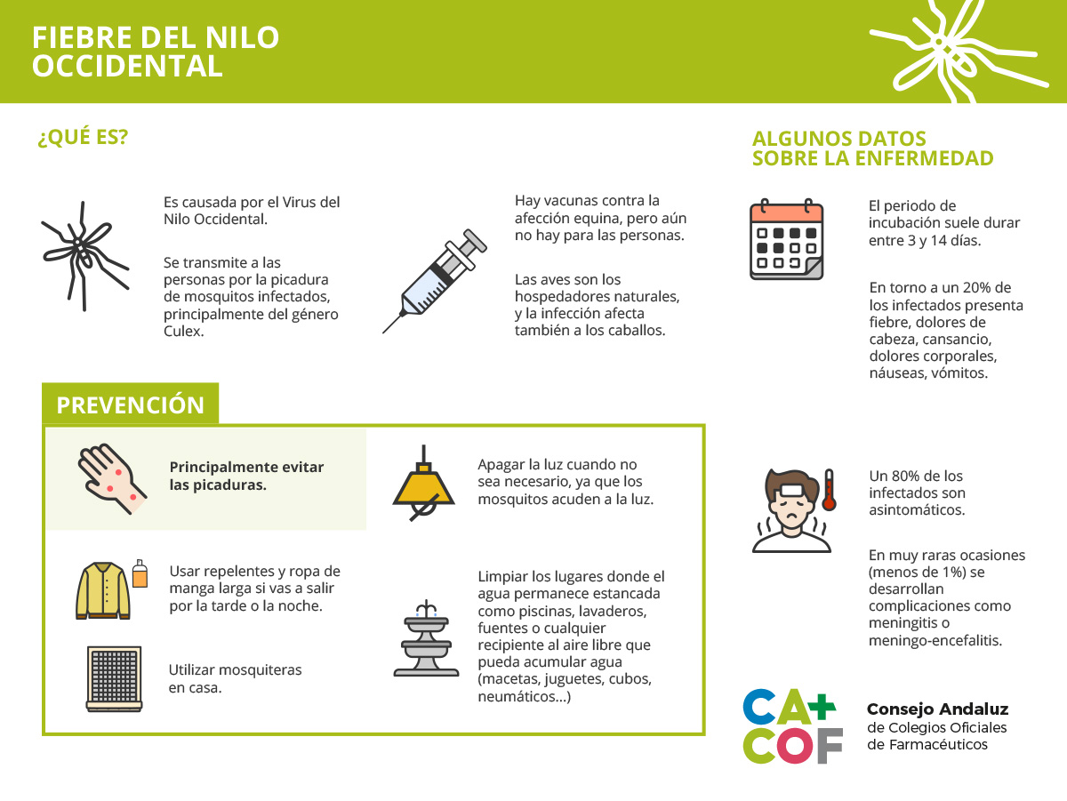Con motivo de la detección en circulación del virus de la Fiebre del Nilo Occidental en varios municipios de Andalucía durante el verano, el CACOF ha editado el material actualizado de la campaña “Prevención de la Fiebre del Nilo Occidental”, con los que la farmacia comunitaria andaluza quiere informar sobre qué es y en qué consiste esta enfermedad, así como ofrecer varios consejos y recomendaciones útiles para prevenirla, evitando principalmente las picaduras de mosquitos.